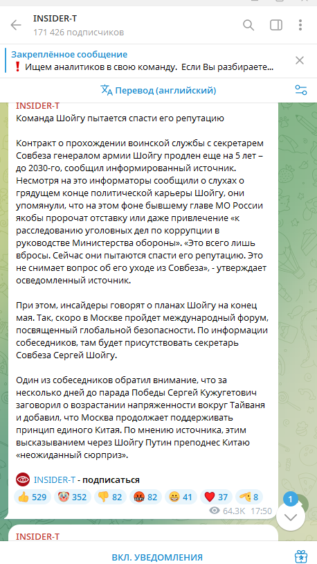 Есть и ещё кое-что интересное. Это раздвоение личности INSIDER-T. Сначала они пишут об отставке Шойгу. А затем в том же посте обещают, что в конце мая Сергея Кужугетовича ждёт грандиозное событие - международный форум, посвящённый глобальной безопасности. И там предстоит плотная работа со всеми важнейшими партнёрами из стран мира.