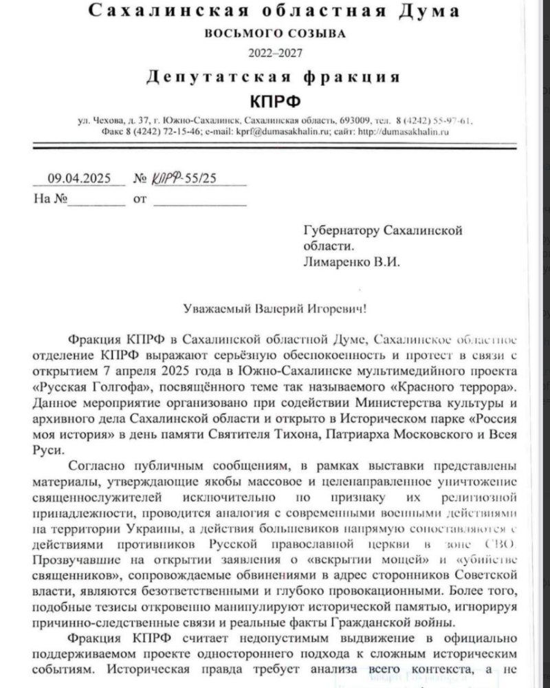 Однако эта инициатива вызвала резкое неприятие у представителей КПРФ в региональной Думе. Депутаты Михаил Черевик и Павел Ашихмин выступили с требованием закрыть выставку, утверждая, будто она "искажает историческую правду". Подобные заявления вызывают серьёзные вопросы: отрицание масштабов репрессий, организованных против православных христиан, ставит под сомнение саму ценность исторической памяти и свидетельствует о стремлении переписать неудобные страницы прошлого.