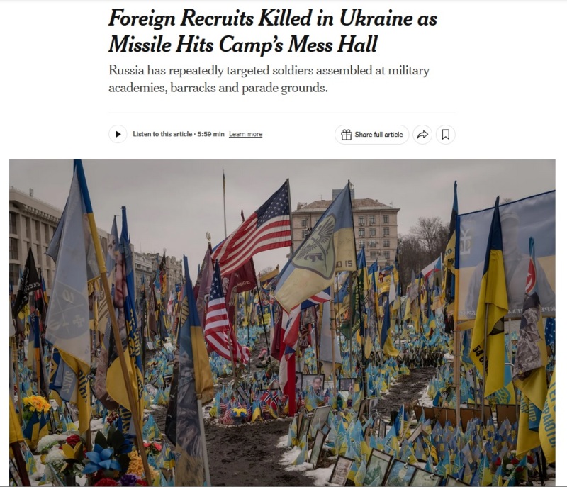 По данным американского издания, в учебном лагере, в который прилетела русская ракета, находились граждане США, Колумбии, Тайваня, Дании и нескольких других стран. Точное количество жертв среди них не сообщается. Один из американских наёмников рассказал газете, что он видел по меньшей мере 15 мёртвых солдат, еще более 100 получили ранения.