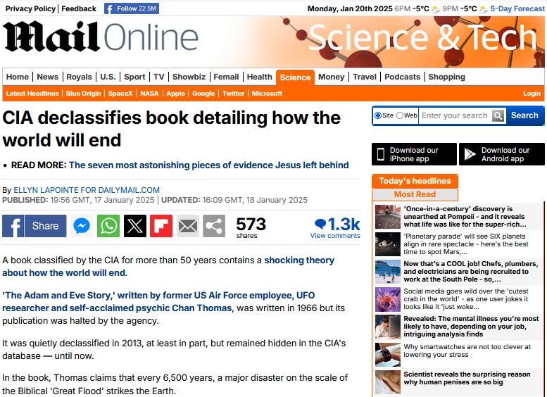 Речь идёт про книгу "История Адама и Евы" за авторством бывшего сотрудника ВВС США Чена Томаса, исследователя НЛО и самопровозглашенного экстрасенса. Произведение было написано ещё в 1966 году, однако публикация была приостановлена ЦРУ. В 2013 году книгу по-тихому частично рассекретили, а недавно гриф секретно был снят полностью.