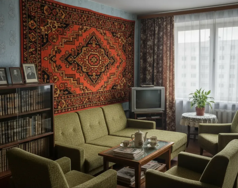 В советских квартирах чаще всего висели фабричные ковры с крупным узором в центре (цветы или геометрические фигуры) и бордюрным обрамлением. Преобладали неяркие цвета: бордовые, терракотовые, оливковые и охристые.