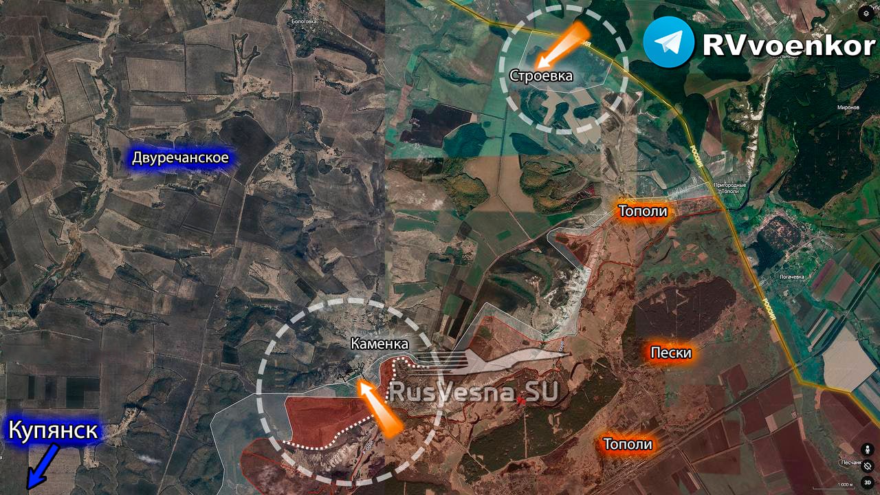 Военные эксперты предполагают, что занятие Строевки направлено на продвижение и соединение с группировкой, которая ведёт бои в районе села Каменка. Там как раз тоже продвигаются русские войска и уже заняли лесной массив Малый Двуруб.