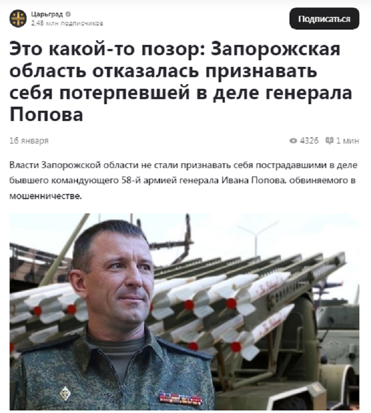 Это какой-то позор: Запорожская область отказалась признавать себя потерпевшей в деле генерала Попова Фото: Царьград