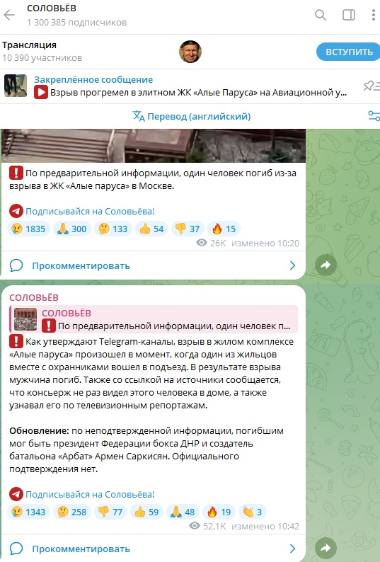 О другой версии, взрыв – покушение на главу Федерации бокса ДНР и создателя батальона "Арбат" Армена Саркисяна. А дальше мнения расходятся. Одни источники говорят, что Саркисян погиб. Другие настаивают, что он выжил и доставлен в реанимационное отделение. Отметим, что 46-летний Саркисян занимался подготовкой наших бойцов в Горловке. Он в розыске на Украине. В частности, о том, что цель покушения Саркисян, говорится в сообщении на страницах телеграм-канала тележурналиста Владимира Соловьёва.