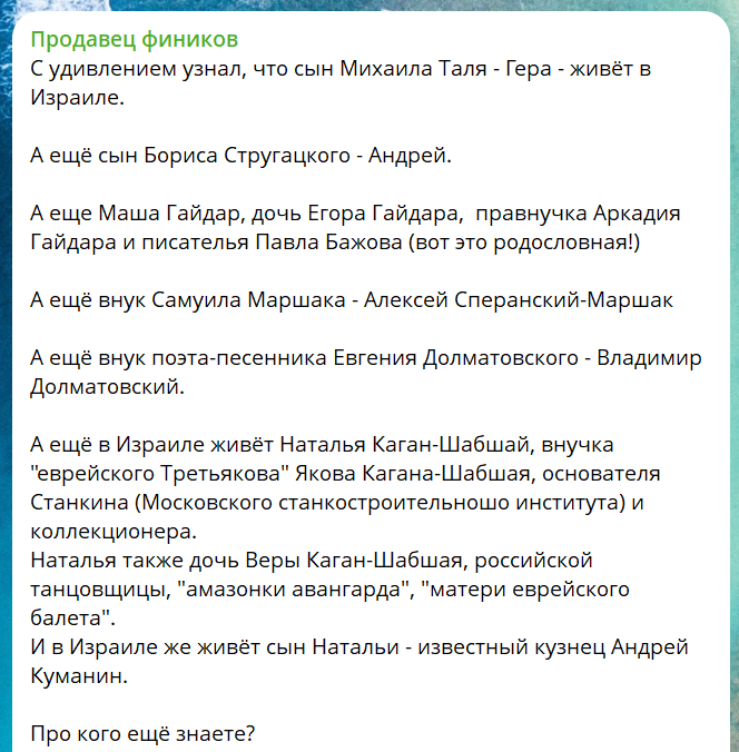 Кто теперь живёт в Израиле? Даже внук Говорухина там. Сдали всех