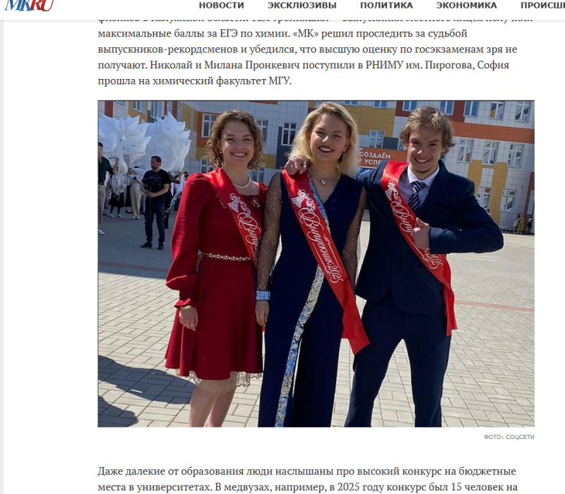 Тем временем журналисты выяснили, куда поступила талантливая троица. Оказывается, Николай и Милана теперь - студенты РНИМУ им. Пирогова. А София выбрала химфак МГУ. В общем, все трое выбрали самые престижные вузы России - те, что считаются лучшими. Топовыми.