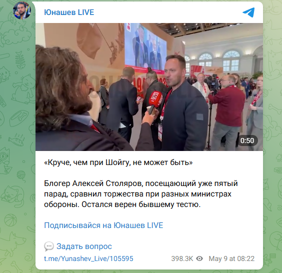 Бывший зять Сергея Шойгу, блогер-миллионник Алексей Столяров куда-то "пропал" после череды скандалов. Точнее - из светской хроники его имя постепенно испарилось. Но к удивлению публики нашёлся Столяров не абы где, а на московском Параде Победы - благо, прийти туда мог любой желающий. Блогер даже успел немного обхаять парад - мол, круче, чем при его бывшем тесте, уже не будет.