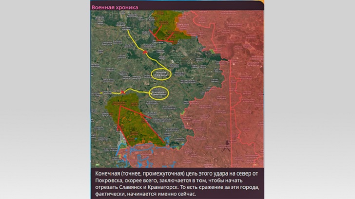 Встречные удары с севера и юга могут избавить русскую армию от необходимости многомесячного сражения за городскую агломерацию, а русский город Славянск - от угрозы разрушения. Источник: ТГ-канал "Военная хроника"
