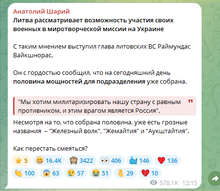 Вот и Литва пытается не отставать от старших "партнёров". Любопытно, что там уже начали собирать "миротворческое" подразделение. И даже наполовину его набрали. При этом Раймундас Вайкшнорас напоминает, кто главный враг Литвы - а то вдруг забудут?