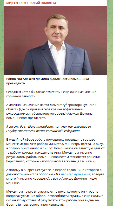 Стоит отметить, что ещё при отправлении Дюмина на "гражданку" в политических кругах говорили: президент Владимир Путин даёт "любимому генералу" набраться управленческого опыта. И год назад, в то же время, когда в Минобороны России начались масштабные чистки с громкими арестами, Дюмин получил должность помощника президента и секретаря Государственного Совета России.