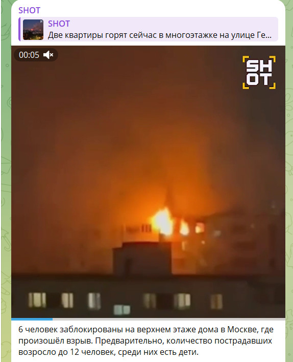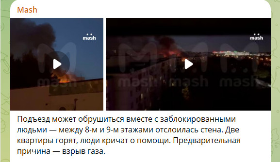 Вскоре MASH добавляет, что жильцов соседних подъездов эвакуируют из горящего дома. Предварительно количество пострадавших увеличилось до 15. Одного человека из квартиры №414 удалось спасти.