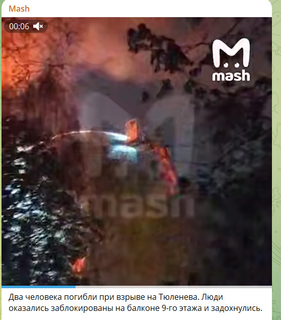 Позже источник сообщает, что два человека погибли при взрыве на Тюленева. Люди оказались заблокированы на балконе 9-го этажа и задохнулись. Двоих детей госпитализировали после взрыва. В больницу везут также 40-летнего пострадавшего. На место едут два пожарных крана.