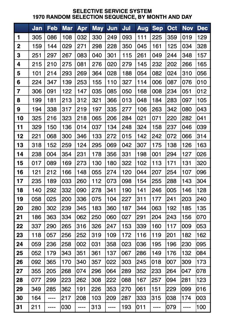 Суть процесса была такой: представители СВП запустили в прямом эфире натуральную лотерею, правда, простые американцы молились о проигрыше, а не о победе. Работники призывной службы взяли 366 записок, на каждой из которых был написан день, в том числе 29 февраля. После чего каждая записка клалась в небольшую капсулу, а эти капсулы клались в прозрачную урну, откуда призывная комиссия их и доставала. 1 декабря 1969 года прошла первая "игра". Первая капсула - 1 июля. Значит, все молодые люди в возрасте от 18 до 26 лет, родившиеся 1 июля, должны были поехать на войну. И если оценивать эту лотерею объективно, то она правда прошла без предвзятости: и бедные, и богатые - воевать уехали все, кто не спрятался в Канаде.
