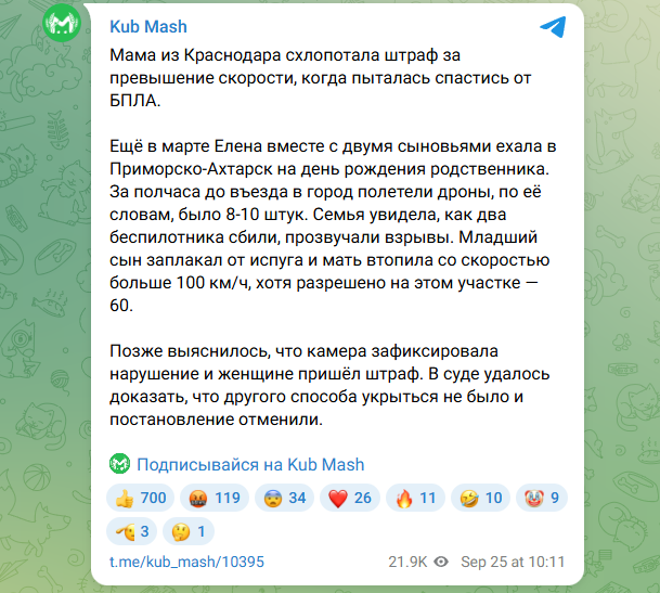 Однако она решила добиться справедливости и оспорила штраф в суде. Выслушав доводы, судья постановил: у матери не было другого способа спастись от атаки дронов, ведь никаких укрытий на дороге или рядом с ней нет. Так что штраф отменили.