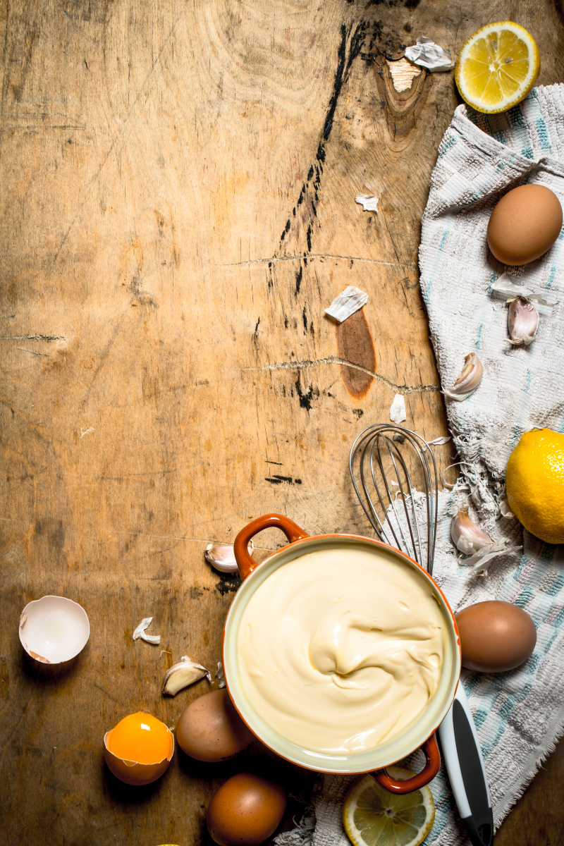 2 яичных желтка он взбивает венчиком, после чего тонкой струйкой вливает туда 250 мл оливкового масла, не прекращая взбивание. Как только масса загустела, добавляет 2 чайных ложечки горчицы и столовую ложку лимонного сока. После чего продолжает взбивать до желаемой густоты.