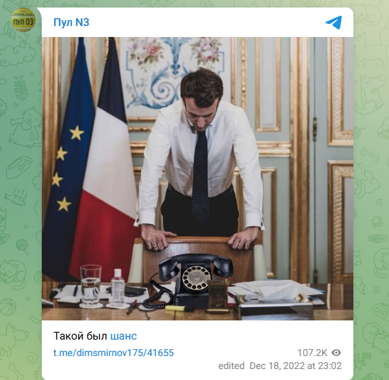 Макрон нет-нет, да становился героем забавных мемов. Например, после победы аргентинской сборной в соцсетях шутили про то, что проиграли французы зря. Теперь Путин звонит с поздравлениями в Аргентину, а не во Францию. А ведь Эммануэль грустно ждёт над телефонным аппаратом…