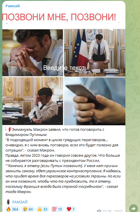 Разумеется, такого звонка Макрон так и не дождался. Путин ещё в интервью американскому журналисту Такеру Карлсону сказал, что это Запад заварил кашу на Украине, поэтому Западу теперь её и расхлёбывать. Поэтому это западные лидеры должны звонить и договариваться с Россией, а не наоборот.