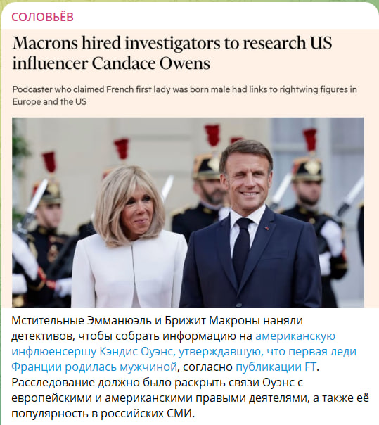 История настолько чудовищная, что она говорит даже не столько о Кэндис Оуэнс или о настоящем поле Брижит Макрон, она говорит о таком состоянии деградации современного западного либерального общества, что даже критиковать всё это или осмеивать уже слишком мелко. Перед нами коллапс европейского мышления. Недавно наш президент сказал, что главная проблема Европы в том, что они потеряли разум. Кажется, это очень серьёзный диагноз.