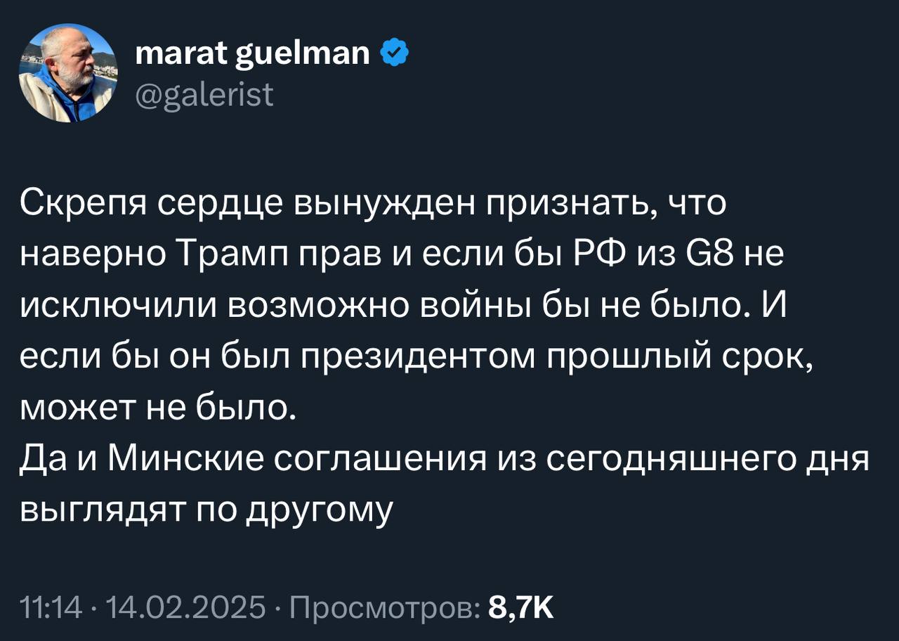 Президент США Дональд Трамп был прав, когда говорил, что Россию не следовало исключать из Большой восьмёрки (G8). Такое заявление "скрепя сердце" сделал скандальный иноагент, террорист, экстремист и галерист Марат Гельман*.