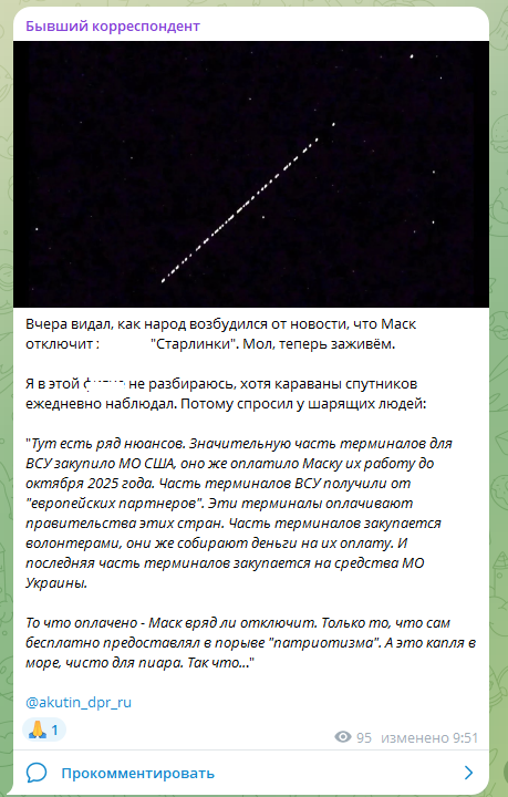 Донецкий журналист Алексей Акутин отмечает, что новости о грядущем отключении для ВСУ системы Starlink многих, конечно, обрадовали. Но напрасно. Опрошенные Акутиным знающие люди подсказали: едва ли Маск пойдёт на такой шаг. Как говорится, за всё заплачено.