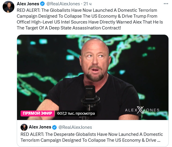 Американский журналист и ведущий Алекс Джонс снова сделал громкое заявление. По его словам, украинские спецслужбы уже убрали блогера Гонсало Лиру, а теперь якобы начали готовить ликвидацию Илона Маска, семьи Дональда Трампа, ведущего InfoWars Чейза Гейзера и самого Джонса.