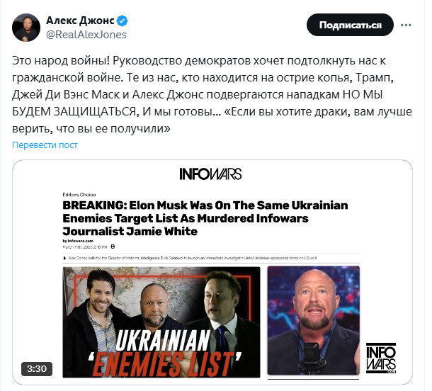 Руководство демократов хочет подтолкнуть нас к гражданской войне. Те из нас, кто находится на острие копья, Трамп, Джей Ди Вэнс, Маск и Алекс Джонс, подвергаются нападкам. НО МЫ БУДЕМ ЗАЩИЩАТЬСЯ, И мы готовы... "Если вы хотите драки, вам лучше верить, что вы её получили",