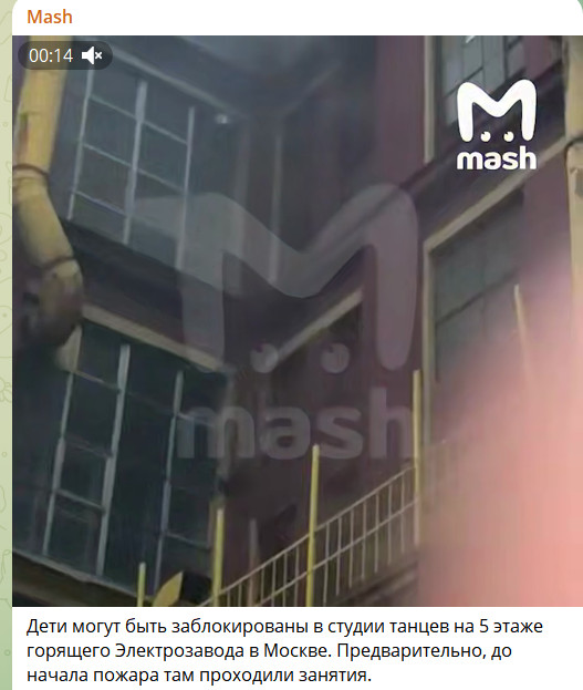 Позже источник уточнил, что в студии танцев на 5-м этаже горящего бывшего Электрозавода в Москве могут быть заблокированы дети. Предположительно, до начала пожара там проходили занятия.