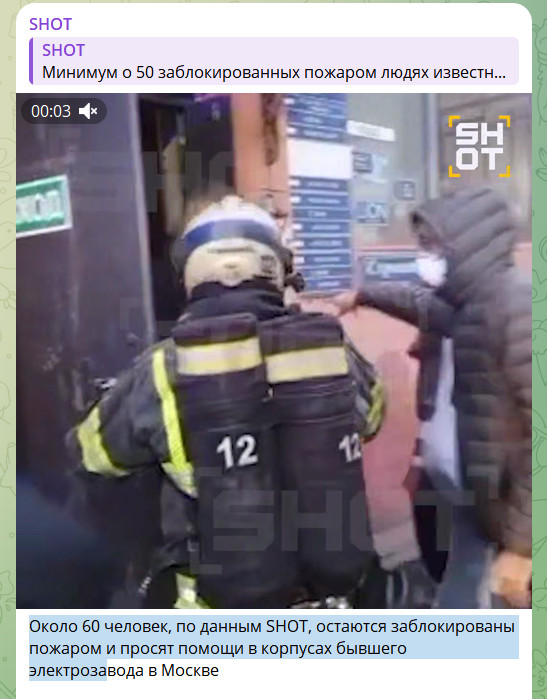 Канал SHOT добавляет, что число пострадавших может вырасти - внутри по-прежнему несколько десятков заблокированных людей. Ранг пожара повышен до третьего. Вскоре, в 18.30, источник сообщил о 60 заблокированных. И это число пока не окончательное.