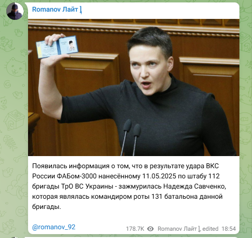 Напомним, на днях военный блогер Владимир Романов сообщил о том, что в зоне проведения СВО была, возможно, ликвидирована Надежда Савченко. Он отметил, что это могло произойти 11 мая вследствие удара ВКС России ФАБ-3000 по штабу 112-й бригады теробороны ВСУ. Савченко была командиром 131-го батальона этой бригады.