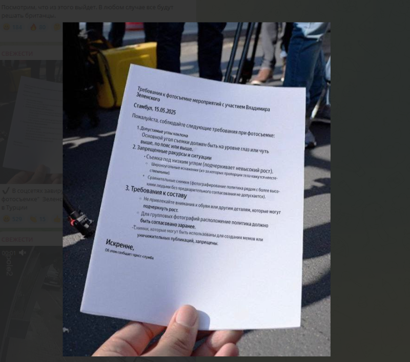 В Стамбуле журналистам, как выяснилось, раздали очень ценные указания, которые уже получили название "методички Зеленского". Там объяснялось, как правильно снимать прибывшего в Турцию нелегитимного президента Украины. Особенное внимание уделялось низкому росту Зеленского - чтобы не подчёркивать столь досадное обстоятельство, главаря киевского режима запрещено снимать с некоторых ракурсов или рядом с высокими людьми. А ещё "запрещены снимки, которые могут использоваться для мемов". Серьёзно, так и написано.