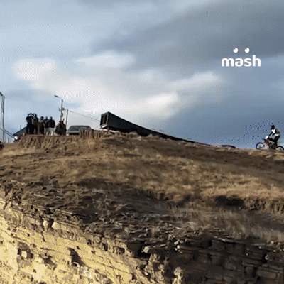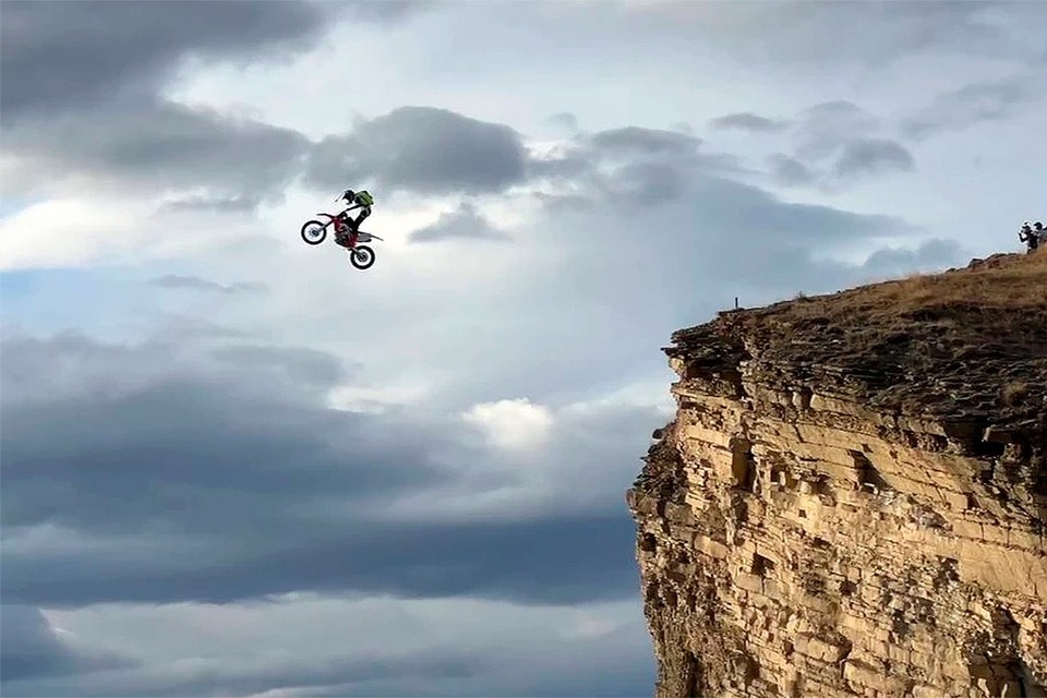Экстремал-мотоциклист Николай Цибулько 23 октября совершил рискованный прыжок на мотоцикле в пропасть в дагестанском селе Кули Кулинского района. Он разогнался на трапе, специально установленном на горе, и прыгнул вниз, используя парашюты для подстраховки.