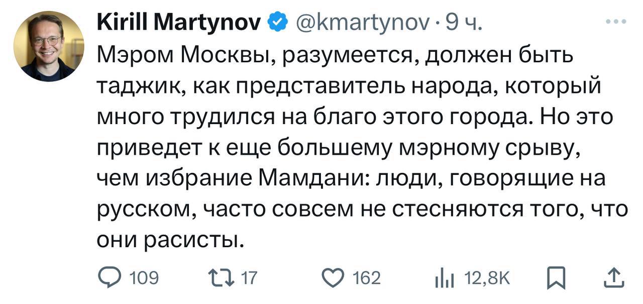 Следом за Соросом подтянулись и иноагенты. Отличился главный редактор "Новой газеты. Европа"* Кирилл Мартынов**. Он заявил, что, раз в Нью-Йорке победил мигрант-мусуьманин, значит, в Москве мэром надо сделать таджика.
