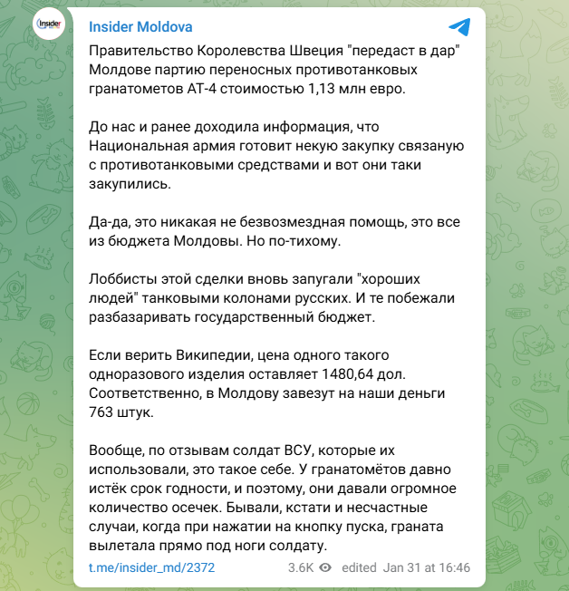 И вот в Стокгольме с гордостью объявляют о передаче "в дар" Молдавии партии переносных противотанковых гранатомётов АТ-4 стоимостью 1,13 млн евро. Однако, передают информированные источники, про "дар" - это шведы загнули. Гранатомёты оплачены из молдавского бюджета.