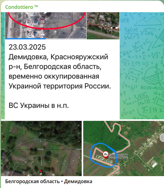 По информации военволонтёров канала "Два майора", основные события в Белгородской области развернулись у Демидовки. Судя по сообщениям с мест, населённый пункт переходил из рук в руки.