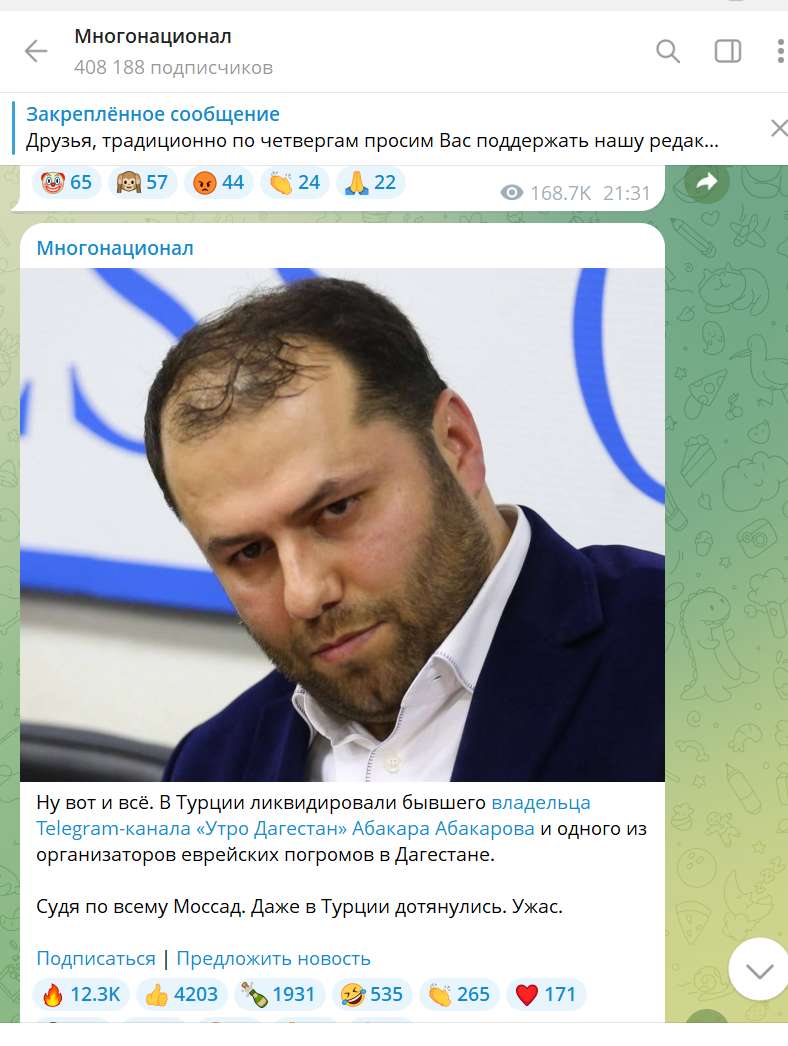 Абакаров к моменту начала этой провокации жил в Турции. Что не мешало ему контролировать процессы, связанные с каналом "Утро Дагестана". В России в отношении Абакарова возбуждено уголовное дело, связанное с погромами 2023 года.