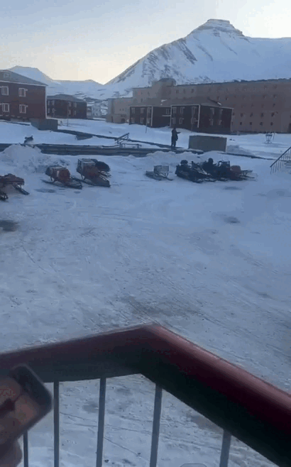 Видео из Пирамиды появилось в Сети пару дней назад. В кадре видно, как белоснежный косолапый пришёл в посёлок и стал заинтересованно преследовать встретившегося на его пути мужчину. Попытки окружающих отогнать опасного хищника выстрелами в воздух не увенчались успехом - косолапый не впечатлился и продолжил преследование, однако и убегавший от него мужчина тоже был целеустремлён как никогда. Мужчина ловко запрыгнул в снегоход и смог уйти от своего преследователя.