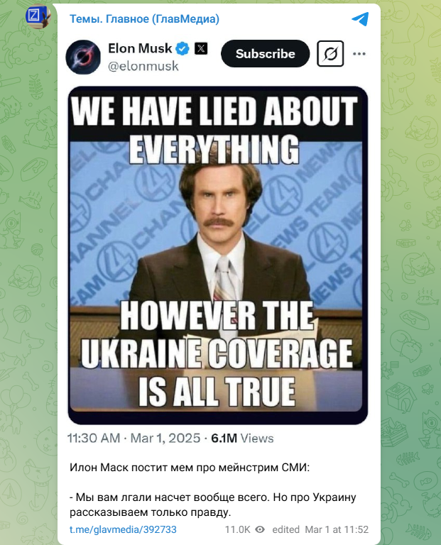 Маск в целом с иронией оценивает современные СМИ, особенное внимание традиционно уделяя той прессе, которая с подозрительным усердием нахваливает все эти годы киевский режим. Возглавивший по инициативе Трампа новый американский департамент эффективности правительства США Маск уже успел высмеять "независимые медиа" на Украине и в России, которые лишились финансирования за счёт американских грантов после закрытия фонда USAID.
