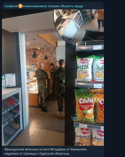 Появились и первые фото, обнародованные каналом "Графиня", на которых, как утверждается, запечатлены офицеры НАТО - французские военные на юге Молдавии, в районе Чимишлии, недалеко от одесской границы.