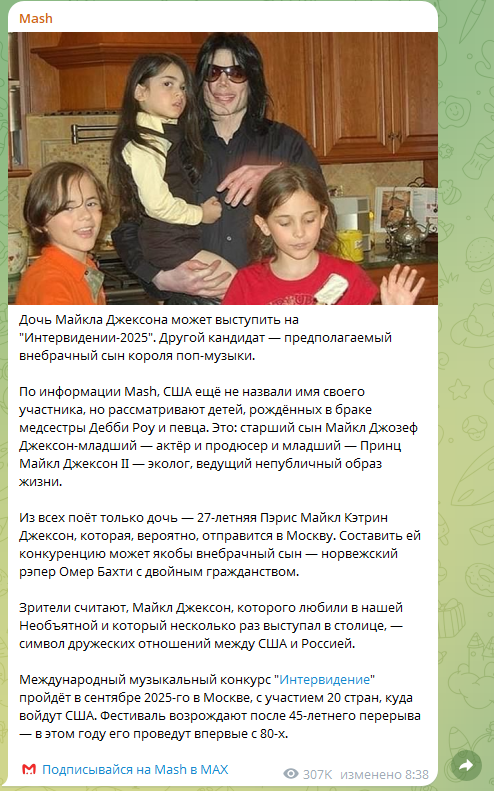 На "Интервидении" будут петь дети Майкла Джексона: Дочь представит США, сын - Норвегию
