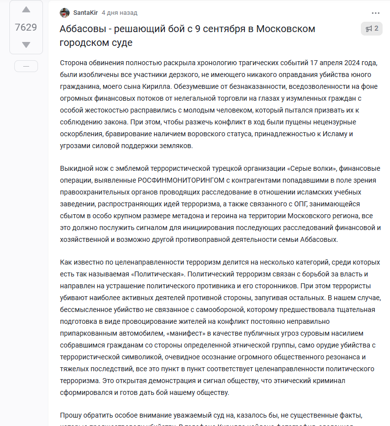 Бессмысленное убийство, не связанное с самообороной, которому предшествовала тщательная подготовка в виде провоцирования жителей на конфликт постоянно неправильно припаркованным автомобилем, "манифест" в качестве публичных угроз суровым насилием собравшимся гражданам со стороны определённой этнической группы, само орудие убийства с террористической символикой, очевидное осознание огромного общественного резонанса и тяжёлых последствий - всё это пункт в пункт соответствует целенаправленности политического терроризма. Это открытая демонстрация и сигнал обществу, что этнический криминал сформировался и готов дать бой нашему обществу,