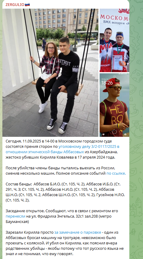Напомним, 17 апреля на Краснодарской улице в Москве 24-летний мотоциклист Кирилл Ковалёв был жестоко убит членами банды мигрантов из Азербайджана. Парень сделал одному из иностранцев замечание - тот, вообразив себя "хозяином жизни", припарковал машину на тротуаре, перекрыв путь пешеходам.