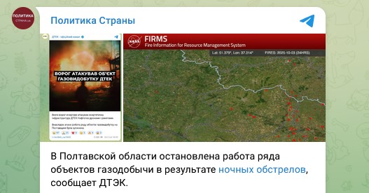 По данным украинской ДТЭК, после ночных ударов в Полтавской области остановлена работа ряда объектов газодобычи. Тем временем спутники NASA показали поражённые за последние дни Вооружёнными силами России объекты. Шутки о "слабых ударах" и "бутафорных ракетах" России уже не мелькают в украинских пабликах.