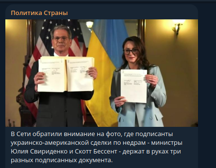 В Сети обратили внимание на фото, где подписанты украинско-американской сделки по недрам - министры Юлия Свириденко и Скотт Бессент - держат в руках три разных документа, хотя Украина официально заявляла о заключении лишь одного.