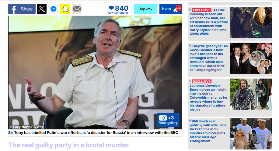 Хитченс обратил внимание на высказывание бывшего главы британских вооружённых сил адмирала Тони Радакина. В интервью Би-би-си тот назвал войну на Украине "катастрофой для России" и пошутил, что улитка пересекла бы Украину быстрее, чем путинская армия. С одной стороны, картина складывается уничижительная: медлительная, слабо вооружённая, потерявшая "миллион солдат" армия.