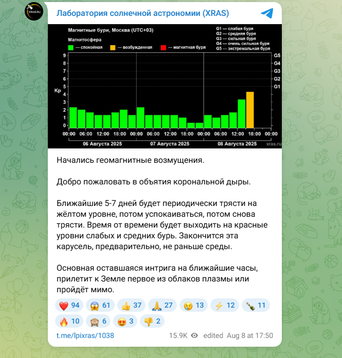 Пиковых значений геомагнитная буря достигнет 2 сентября, во вторник. Тогда сила возмущений поля планеты достигнет категории G3. То есть "сильная" по классификации NOAA.
