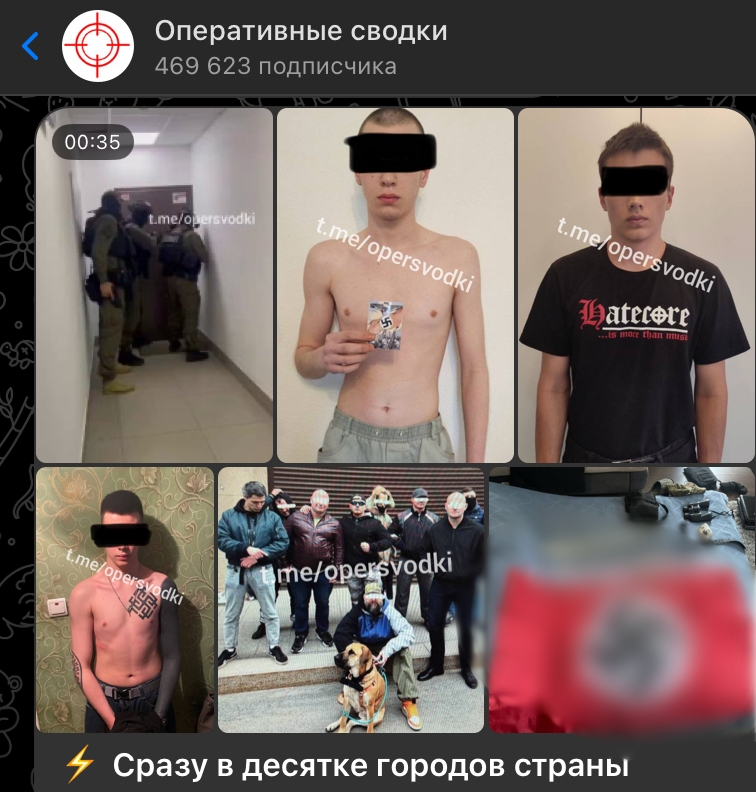Так, в десяти городах России, как пишет телеграм-канал "Оперативные сводки", состоялись масштабные проверки, направленные на выявление неонацистских группировок, которые, по информации наших спецслужб, могут быть задействованы в диверсиях и терактах на территории России. Основную массу задержанных составили сторонники различных террористических организаций, таких как "Русский добровольческий корпус"*, "Легион "Свобода России"*, "Правый сектор"*, "Азов"* и "Маньяки. Культ убийств"*.