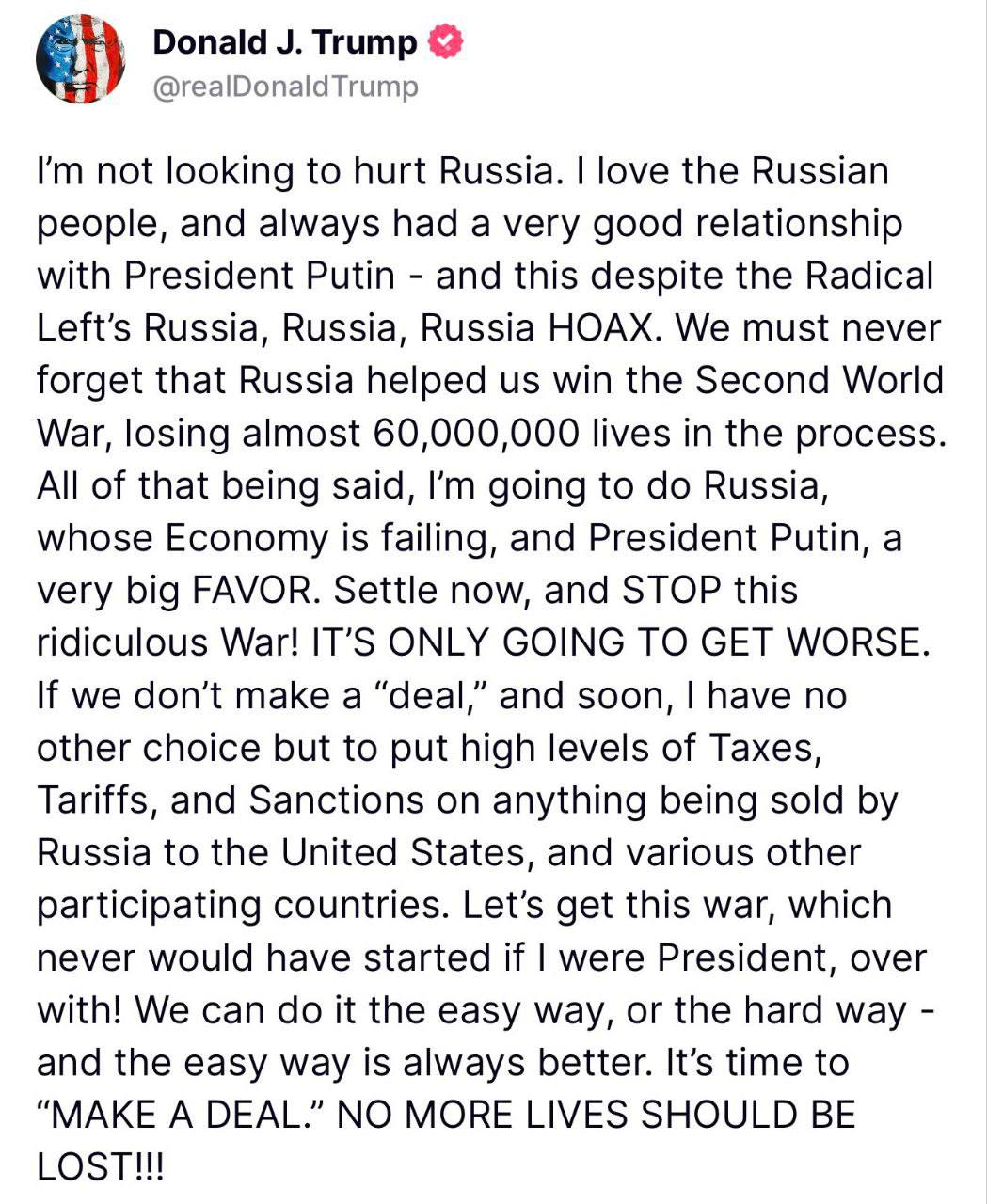 Давайте закончим эту войну, которая никогда бы не началась, если бы я был президентом. Мы можем сделать это простым или сложным путём - но лёгкий путь всегда лучше,