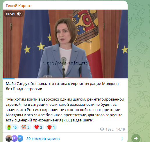 "Выиграв" путём беспрецедентных фальсификаций сперва президентские, а потом парламентские выборы, президент Молдавии Майя Санду решилась на конфликт с Москвой. Теперь понятно, ради чего всё затевалось, ради чего Европа помогала Санду остаться у власти. Теперь ею брошен вызов военным России - мол, они незаконно находятся в Приднестровье. "Есть сценарий присоединения к ЕС в два шага", - объявила Санду.