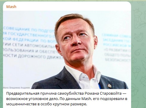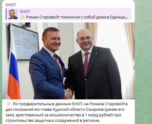 Как сообщил источник Царьграда, на Старовойта дал показания бывший губернатор Курской области Алексей Смирнов, задержанный недавно за хищения при возведении фортификационных сооружений в регионе. После этого последовало увольнение Старовойта, а уже затем экс-министр, предположительно, покончил с собой дома в Подмосковье. Как уточняет канал SHOT, Смирнов, по данным CК, проворачивал схему со своим помощником Алексеем Дедовым. Вместе они получали по 10% отступных от каждого контракта "Корпорации развития", которая занималась постройкой фортификаций на границе с Украиной. Из 15 млрд, выделенных из федерального бюджета на оборону Курской области, по данным следствия, было похищено около 200 млн рублей.