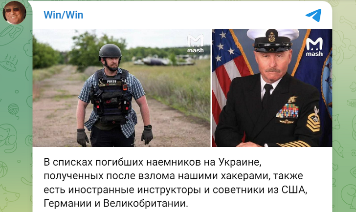 Кстати, в ТГ-канале Win/Win приводятся данные по погибшим наёмникам на Украине, полученные российскими хакерами. Среди погибших иностранные инструкторы и советники из США, Германии и Британии: